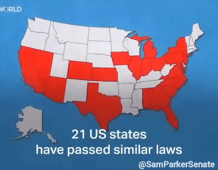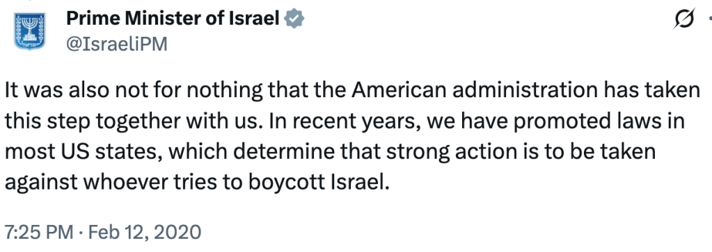 Dans 21 Etats il existe une clause identique, et ce n’est qu’un exemple de ce que l’Etat d’Israël impose aux Américains, comme le gouvernement l’avait ouvertement déclaré en 2020 :