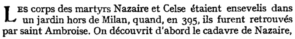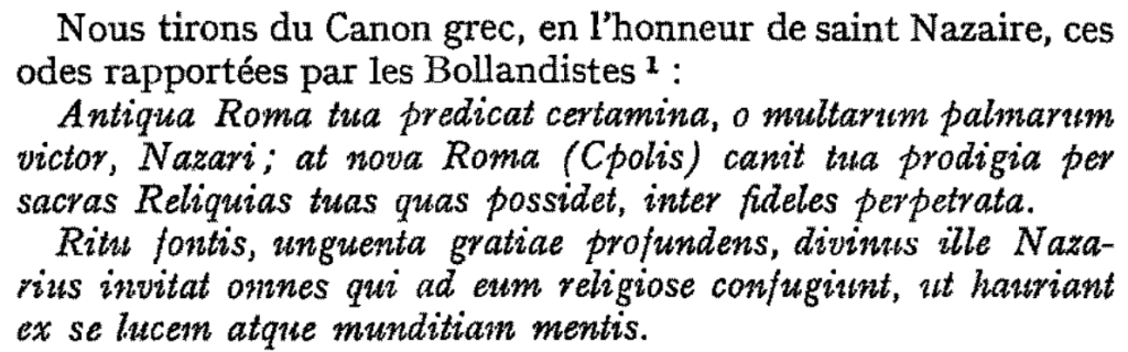 L’antique Rome célèbre à haute voix, Nazaire, tes multiples combats ; et la cité de Constantin, possédant tes reliques sacrées, chante tes miracles en disant : Bénissez le Seigneur, exaltez-le dans tous les siècles.