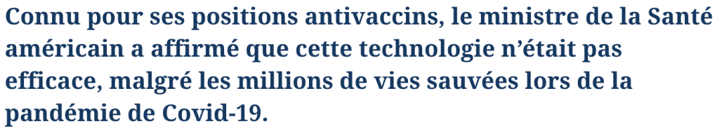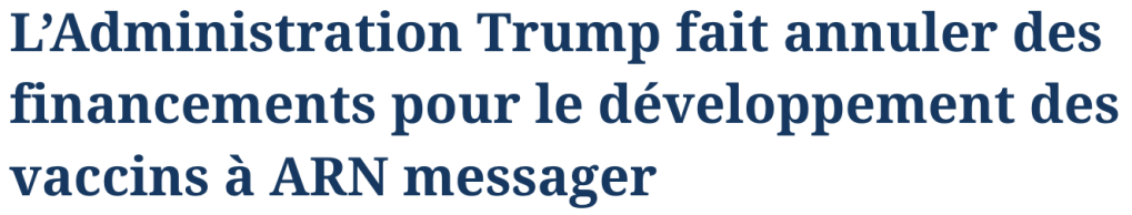 L’ironie est que les vaccins à ARN n’auraient jamais pu être développés aussi rapidement (avec les risques que comportait cette précipitation) sans les milliards de dollars investis par le gouvernement fédéral américain sous l’administration de… Donald Trump soi-même. Qui a maintenant comme ministre de la santé un opposant à toute vaccination en général. Je me demande si le président actuel a même une opinion sur la question.