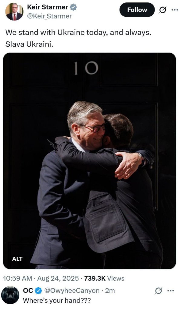 Photo Starmer/Zizilensky: soit il lui pique son portefeuille, soit il vérifie que la baguette pour jouer du piano à queue est toujours opérationnelle.