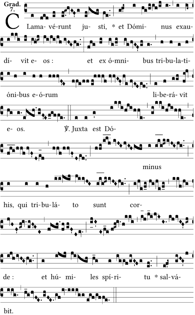 La messe est la troisième du commun des martyrs. En voici le graduel, dont le texte vient du psaume 33. Le verset est somptueusement orné sur Dominus et corde.