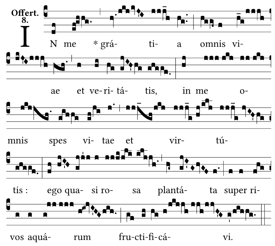La mélodie des première et deuxième phrases est tirée de la fête de la Purification, peut-être en raison du mot gratia, qui apparaît dans les deux Offertoires. Sur le plan du contenu, les deux textes sont également étroitement liés. Diffusa est semble être le thème développé dans l’Offertoire In me. Il nous dit en quoi consiste la plénitude des bénédictions qui ont été déversées sur Marie. L’adaptation de la mélodie est extrêmement ingénieuse. Sur le plan textuel, omnis dans la première phrase appartient au gratia précédent, tout comme dans la deuxième phrase, nous avons omnis spes. La mélodie, cependant, combinerait omnis et viae. Marie peut en effet dire d’elle-même : « En moi est toute la grâce de la vie », mais aussi : « En moi est la grâce d’une vie pleine, d’une vie entière ».