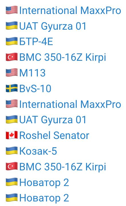 Le site Lostarmour, qui a établi la carte, a donné la liste des véhicules brûlés (il y en a trois autres qui ne peuvent pas être identifiés parce qu’ils brûlent encore).