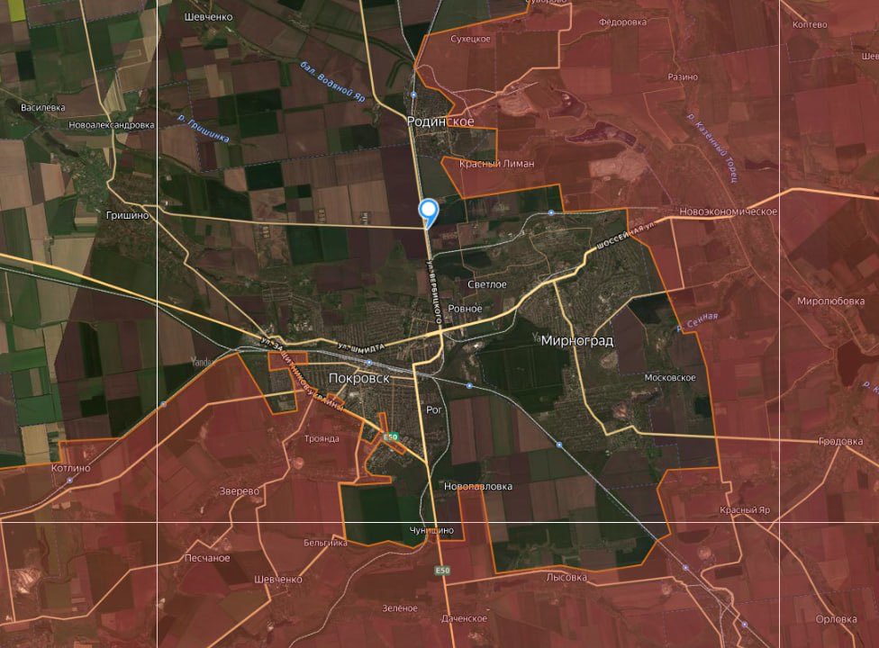 Mais la vidéo (route, carrefour, voie ferrée) permet d’établir très facilement la géolocalisation. Et l’on voit que c’est à mi-chemin entre Pokrovsk (à moitié prise par les Russes) et Rodinskoé (où les Russes sont en train d’entrer), au milieu de la mâchoire qui enserre les lieux.