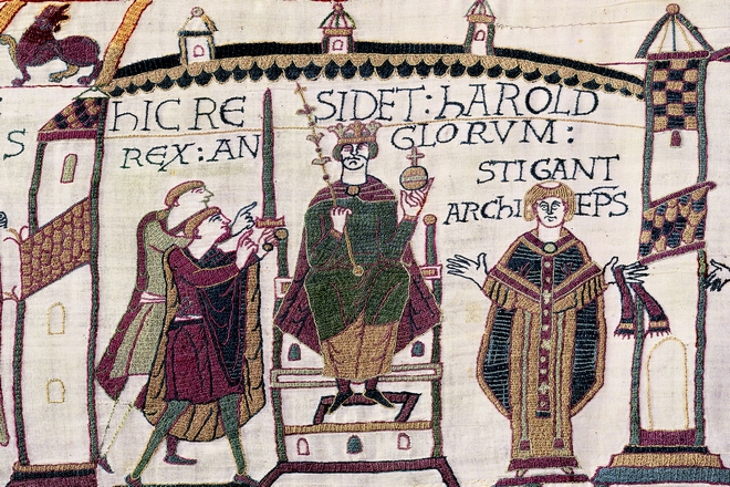 Le début du récit de la Tapisserie de Bayeux présente le vieux roi anglo-saxon Edouard le Confesseur, monté sur le trône en 1042, qui s’entretient avec Harold (1022-1066), son beau-frère issu de la puissante famille de Godwin de Wessex. A la fin du règne d’Edouard, Harold devient peu à peu l’homme fort du pays et porte étendard des anti-normands. Le 6 janvier 1066, Harold est couronné roi à la place de Guillaume de Normandie. A l’aube du 14 octobre 1066 à Hastings, la bataille fait rage contre les troupes de Guillaume venu reprendre son trône. Il meurt au combat après avoir reçu une flèche dans l’œil, symbole de la punition de son parjure.