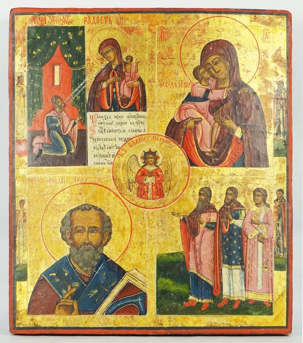 En haut à gauche l’icône dite « Joie inattendue » (conversion d’un pécheur invétéré), à droite la Mère de Dieu Fiodorovskaïa (de Théodore), en bas à droite saint Nicolas, au centre l’Emmanuel « Jésus béni silence », ange du bon conseil avec son nimbe à huit pointes symbole de l’éternité du Verbe. Sur les côtés : en haut à gauche le traditionnel ange gardien, en dessous sainte Matrone de Thessalonique, à droite saint Théodore – d’où le choix de l’icône de la Mère de Dieu, en dessous sainte Pélagie – ce sont les saints patrons de membres de la famille.)
