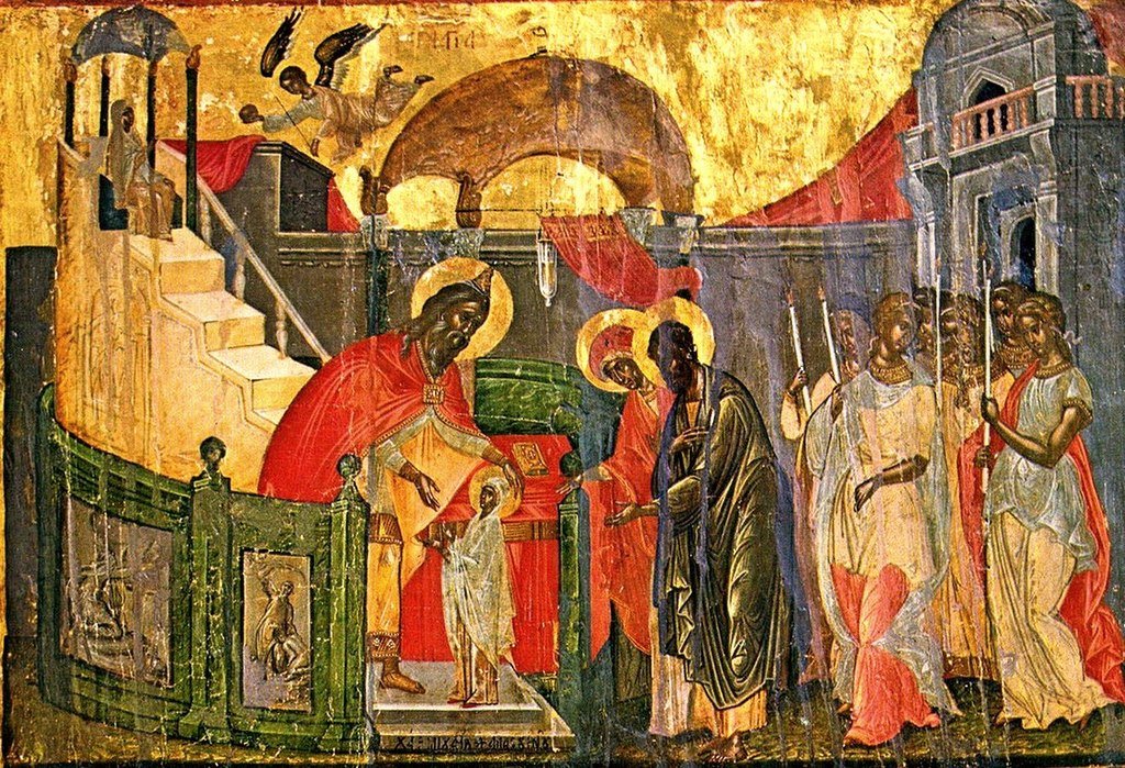 Fidèles, en ce jour chantons en chœur des psaumes et des hymnes au Seigneur, vénérant son tabernacle sanctifié, l’arche spirituelle renfermant le Verbe que nul espace ne contient ; car elle est présentée à Dieu merveilleusement sous la forme d’une enfant, et le grand prêtre Zacharie la reçoit dans l’allégresse comme l’habitacle de Dieu.