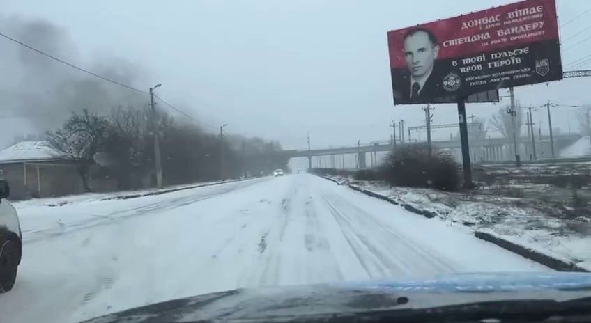 Ce panneau publicitaire prétend que « le Donbass félicite Stepan Badera pour son anniversaire », le 1er janvier. En ukrainien. C’est à Droujovka, dans le petit quart de l’oblast de Donetsk encore sous contrôle ukrainien. Une provocation aussi stupide que surréaliste, dans une région russophone pro-russe qui vomit le souvenir du nazi Bandera.