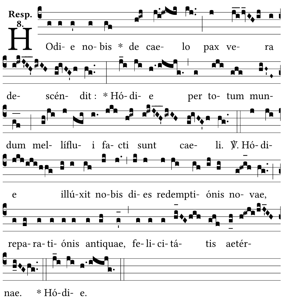℟. Hódie nobis de cælo pax vera descéndit : * Hódie per totum mundum mellíflui facti sunt cæli.