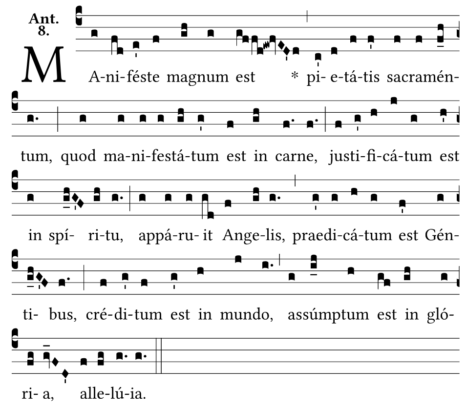 Maniféste magnum est pietátis sacraméntum, quod manifestátum est in carne, justificátum est in spíritu, appáruit Angelis, prædicátum est Géntibus, créditum est in mundo, assúmptum est in glória, allelúja.