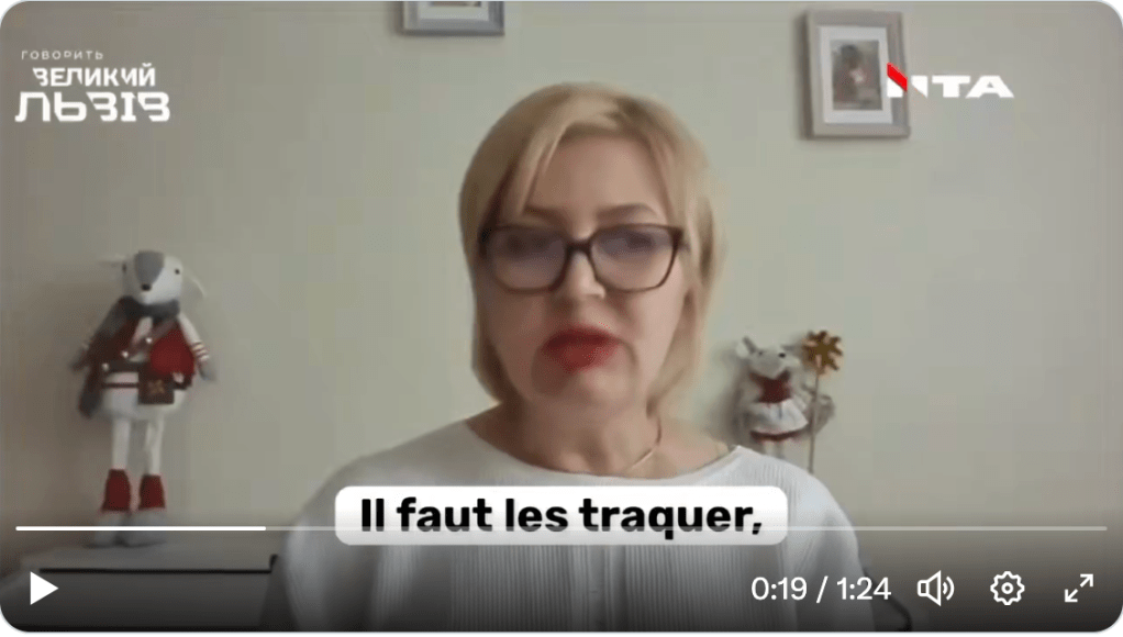 Que les Moscovites ukrainiens se taisent. Qu’ils aient peur d’ouvrir leur bouche moscovite ici, en Ukraine. Car ce n’est pas simplement de la démocratie, ce n’est pas simplement « je parle comme je veux », c’est l’introduction de la politique russe sur le territoire ukrainien. La langue que vous parlez à un moment donné détermine le type d’Etat que vous créez autour de vous. S’ils sont moscovites et continuent à créer leur bulle moscovite en Ukraine, alors ils créent dans cette bulle l’Etat de Moscovie avec leur drapeau national. Il faut les traquer, les poursuivre, les punir, ne pas leur donner la possibilité de s’exprimer en Ukraine. Parce que tout cela est une action anti-étatique de leur part, ce sont des actes anti-étatiques.