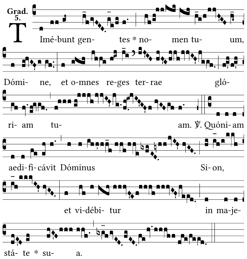 Timébunt gentes nomen tuum, Dómine, et omnes reges terræ glóriam tuam. ℣. Quóniam ædificávit Dóminus Sion, et vidébitur in maiestáte sua.
