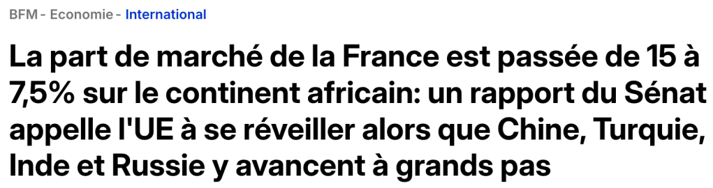 La présence économique de la France en Afrique, dit le rapport, s’est « progressivement érodée au cours des 20 dernières années, passant de 15% de part de marché à 7,5%. »