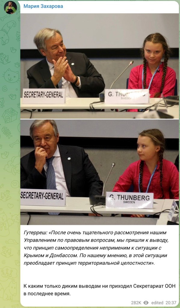 Guterres : « Après un examen très approfondi par notre Direction des affaires juridiques, nous sommes arrivés à la conclusion que le principe d’autodétermination ne s’applique pas à la situation en Crimée et dans le Donbass. À notre avis, c’est le principe d’intégrité territoriale qui prévaut dans cette situation ».