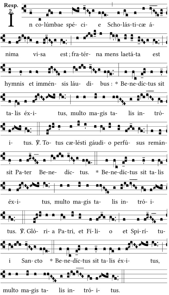 ℟. In columbæ specie Scholasticæ anima visa est, fraterna mens lætata est hymnis et immensis laudibus : * Benedictus sit talis exitus, multo magis talis introitus !