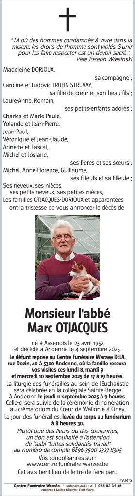 Il y en avait eu un autre, au même endroit, en septembre dernier : l’abbé Marc Otjacques. Ici non seulement c’est sa « compagne » Madeleine Dorioux, ses « enfants de cœur » et « ses petits-enfants adorés » qui annonçaient la triste nouvelle, mais aussi toute la famille de la « compagne », unie à celle du prêtre : « les familles Otjacques-Dorioux ».
