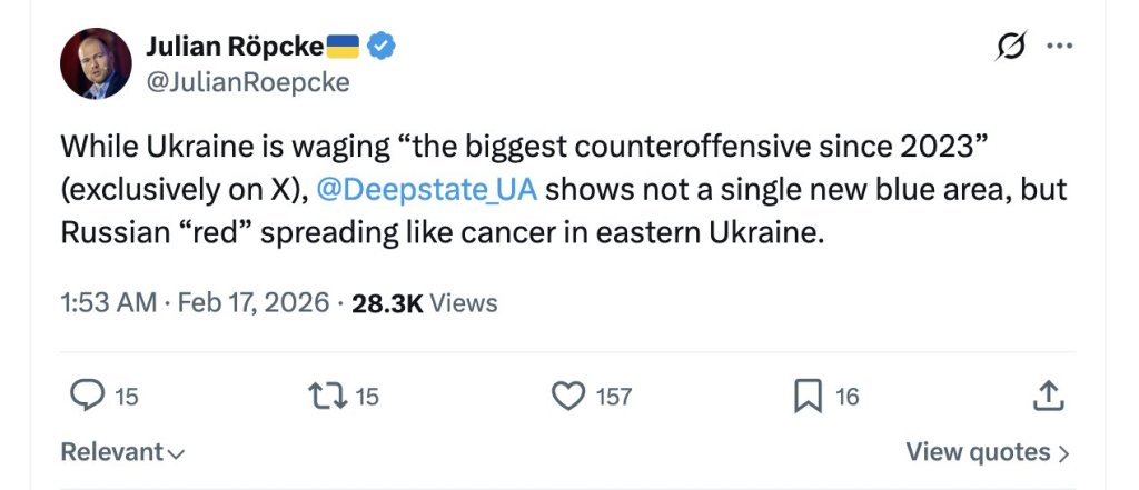 Mais Julian Röpcke, qui suit de très près le conflit depuis le début et qui est un fervent militant pro-Ukraine, écrit que sur les cartes ukrainiennes on ne voit aucune nouvelle zone « bleue » (reprise par l’Ukraine), mais que la zone « rouge » russe « s’étend comme un cancer dans l’est de l’Ukraine ».