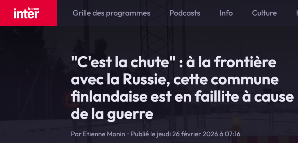 L’article commence par le même mensonge en l’étendant à toute l’Europe : « La guerre en Ukraine pèse sur l’économie des pays européens. » Puis on revient à la Finlande, où « les municipalités qui avaient misé sur les échanges avec la Russie sont au bord de la faillite ». Et l’article évoque l’exemple précis de « Virolahti, petite commune plantée contre la frontière russe ». 3.000 habitants, une dette de 30 millions d’euros.