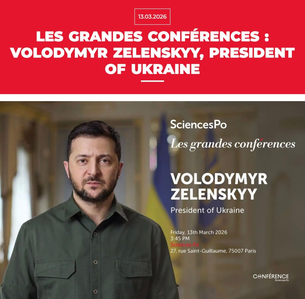 Après son rituel entretien à l’Elysée, Zelensky va faire une conférence à Sciences Po. L’institut de sciences politiques de Paris avait en effet annoncé cette conférence « en ukrainien » de « Volodymyr Zelenskyy, president of Ukraine », « Friday 13th March 2026, 3:45 PM »…