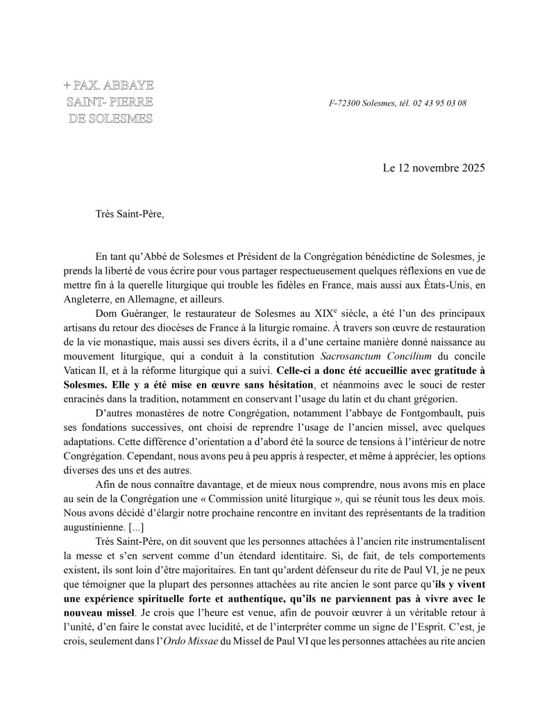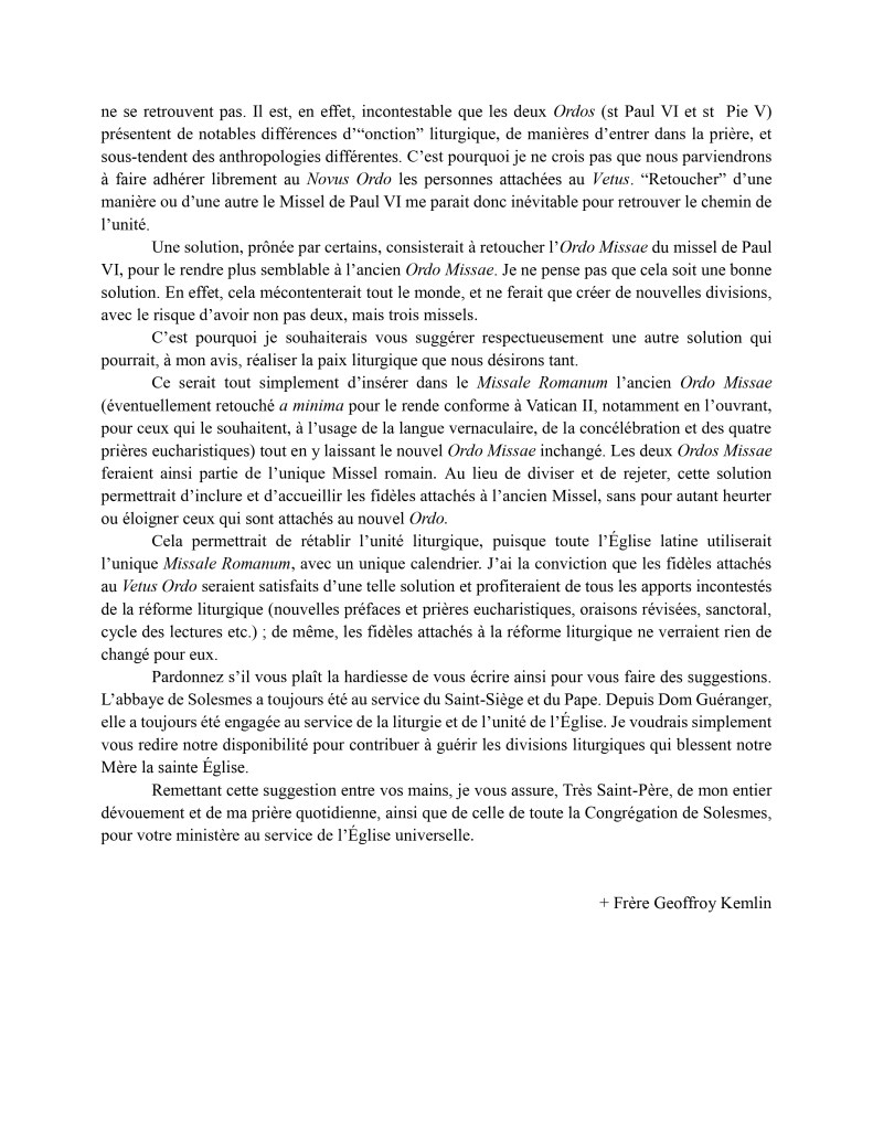 Le père abbé de Solesmes, le TRP Geoffroy Kemlin, a écrit au pape pour lui faire une proposition de paix liturgique. Elle est très simple :