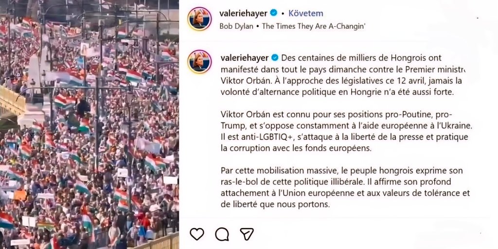 L’eurocruche Valérie Hayer, chef des macronistes du Parlement européen, a publié cela hier. Mais la photo est celle de la gigantesque « Marche pour la paix » organisée par Viktor Orban…