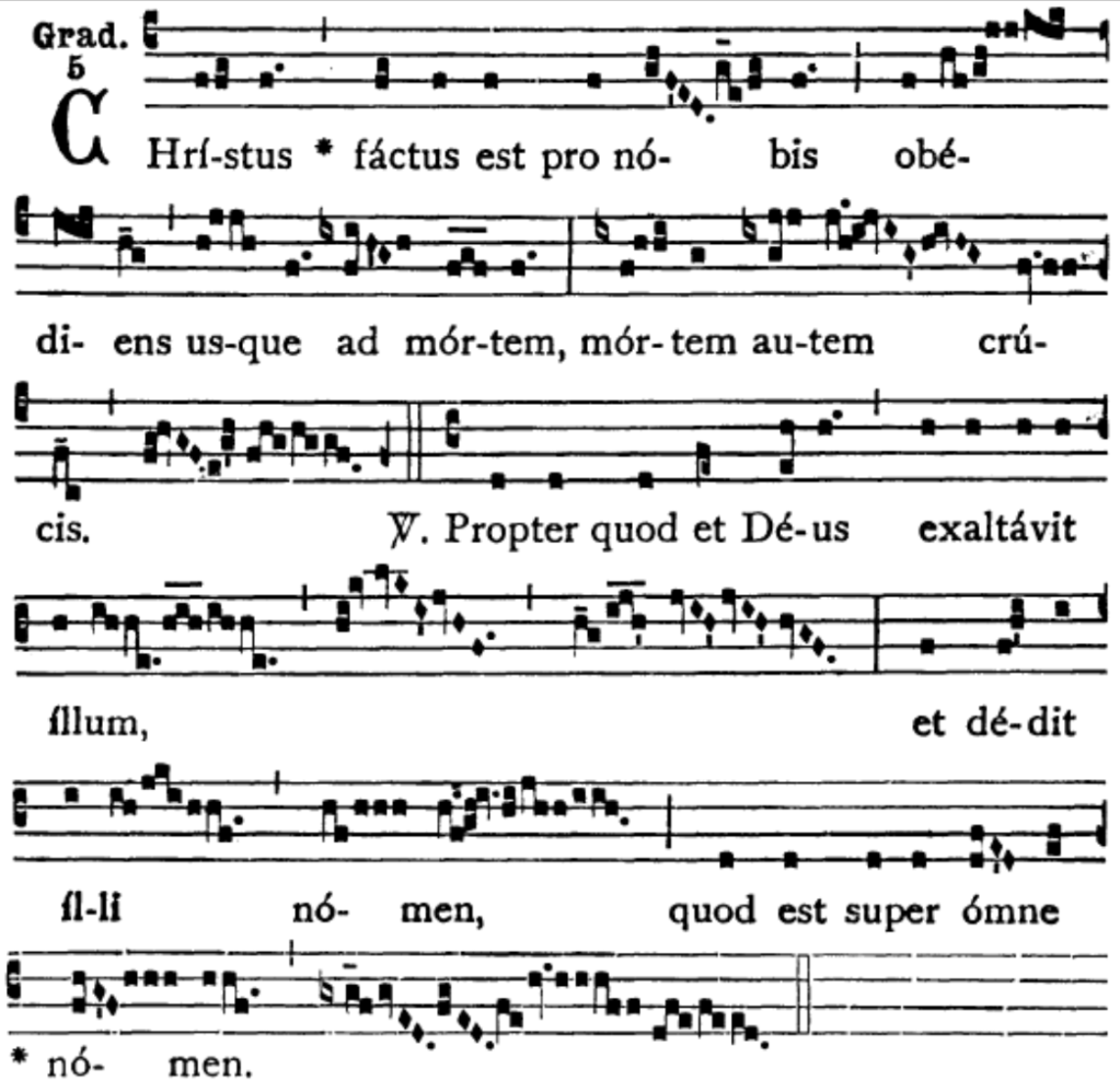 Le corps du graduel exprime un amour reconnaissant pour tout ce que le Christ, dans son humiliation, a fait pour nous. Nobis contribue à produire cet effet. Les manuscrits annotés donnent ici à pratiquement chaque note la forme large. L’interprétation de The Caecilia (29, 49ss) semble quelque peu forcée lorsqu’elle considère obédiens comme un mouvement mélodique agité et y voit la répugnance naturelle que le cœur juvénile du Christ ressentait face à la mort et à la terrible agonie qu’Il allait subir. Cette interprétation suggérerait en outre que l’accord majeur résolu sur usque est apaisant, dans la mesure où il réconcilie le Christ avec le terrible devoir que l’obéissance lui impose. La quarte descendante de crucis peut nous aider à visualiser comment le Sauveur, avec le cri : « Père, je remets mon esprit entre tes mains », a incliné la tête et est mort.