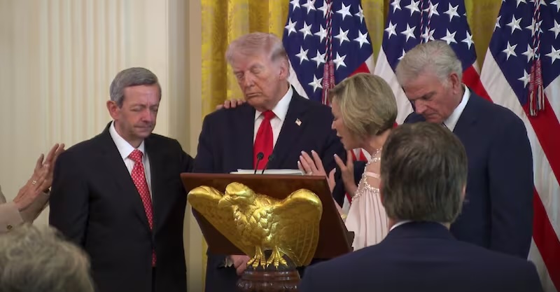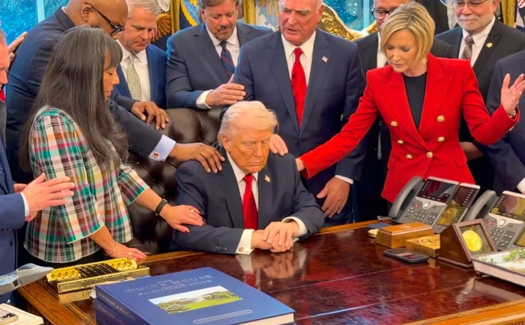 C’était le 4 mars, au début de la guerre contre l’Iran : Donald Trump dans son bureau présidentiel se faisait bénir par son escadron de pasteurs évangéliques (ils sont 36) sous la direction de sa conseillère spirituelle Paul White (à droite en rouge).