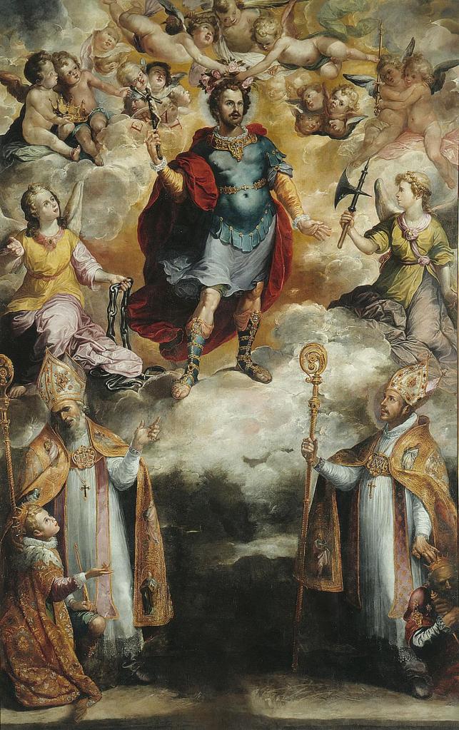 En bas à gauche saint Léandre, évêque de Séville, grand ami de saint Grégoire le Grand. Il protège le jeune Récarède, le frère d’Herménégilde, qui deviendra le roi catholique. A droite saint Isidore, frère et successeur de saint Léandre, qui contemple la gloire d’Herménégilde et maintient à terre le roi arien vaincu par la foi de son fils martyr.
