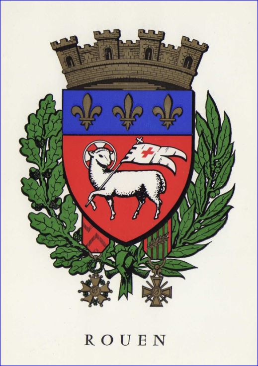 Ceci est le blason de Rouen : « de gueules à l’agneau pascal d’argent, la tête nimbée et contournée, portant une bannerette du même chargée d’une croisette d’or, au chef cousu d’azur semé de trois fleurs de lys d’or »