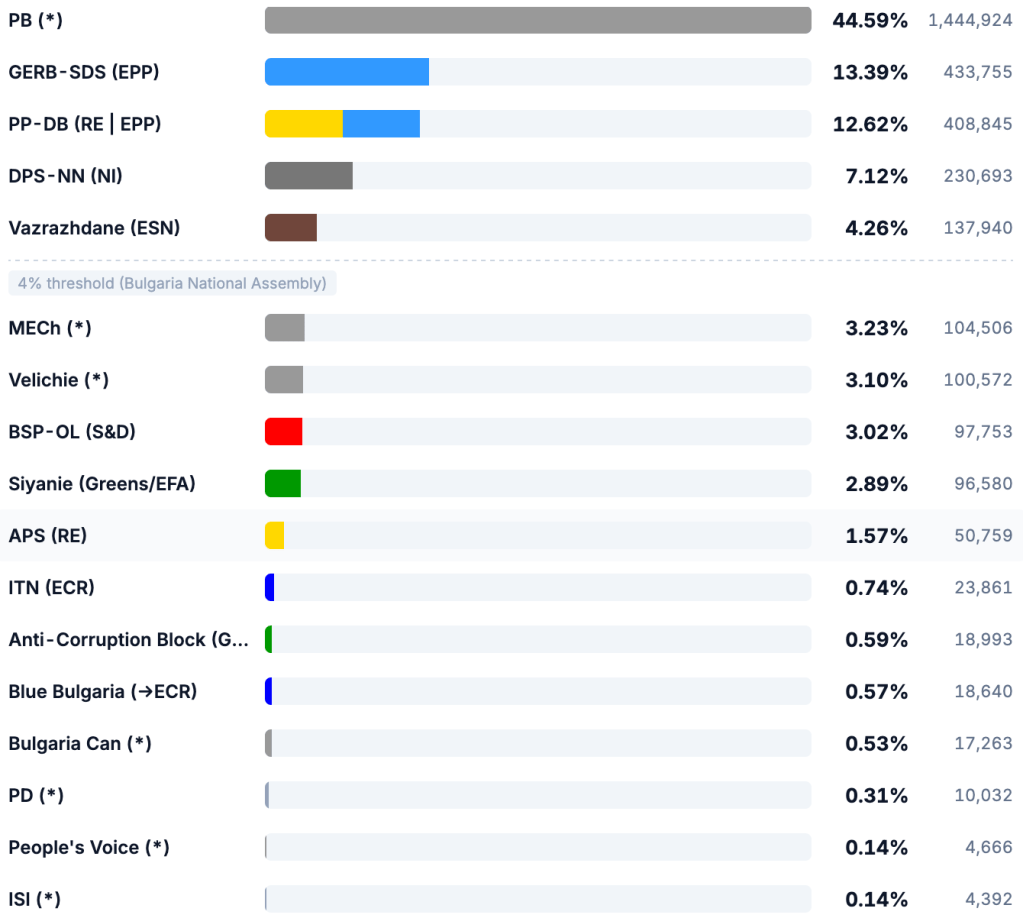 Alors on s’est désintéressé des législatives qui allaient s’y dérouler. Et patatras. L’impensable s’est produit. Un groupe de partis dont le nom n’attirait pas l’attention, la coalition « Bulgarie progressiste » (le progrès, c’est forcément l’UE et ses « valeurs »), est arrivé très largement en tête, et de façon spectaculaire. Voici le résultat final, qui vient de tomber au moment même où j’écris :