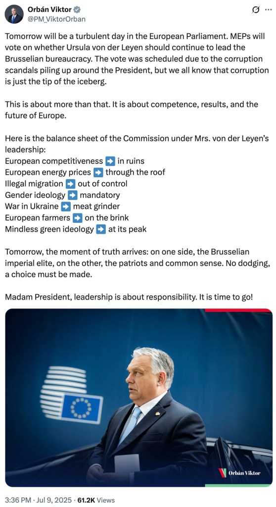 Demain ce sera une journée mouvementée au Parlement européen. Les députés européens voteront pour décider si Ursula von der Leyen doit continuer à diriger la bureaucratie bruxelloise. Ce vote a été programmé en raison des scandales de corruption qui s’accumulent autour de la présidente, mais nous savons tous que la corruption n’est que la partie émergée de l’iceberg.