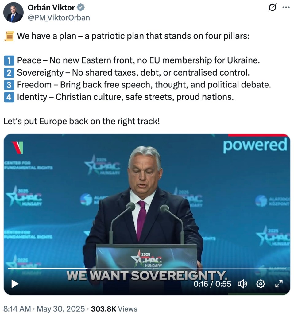Les 29 et 30 mai avait lieu à Budapest une grande réunion de la Conférence conservatrice d’action politique (CPAC), avec notamment Irakli Kobakhidze, le Géorgien qui « a remporté une élection contre le monde entier », le Macédonien Hrisztijan Mickoszki qui a remporté l’élection contre Bruxelles, Robert Fico qui a reçu cinq balles et « se bat comme si de rien n’était », Andrej Babiš, « ancien et futur Premier ministre de la Tchéquie », Santiago Abascal, « notre héros espagnol », l’ancien Premier ministre polonais Mateusz Morawiecki, Alice Weidel, « qui représente la famille du parti de l’Europe des nations souveraines », Herbert Kickl, « un grand combattant autrichien », Geert Wilders, Tony Abbott, etc.