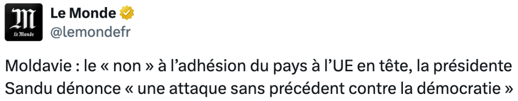 La nuit dernière il était clair que le non l’emportait au référendum censé « confirmer » la candidature de la Moldavie à l’UE. A 2h du matin Le Monde, comme les autres médias, disait :
